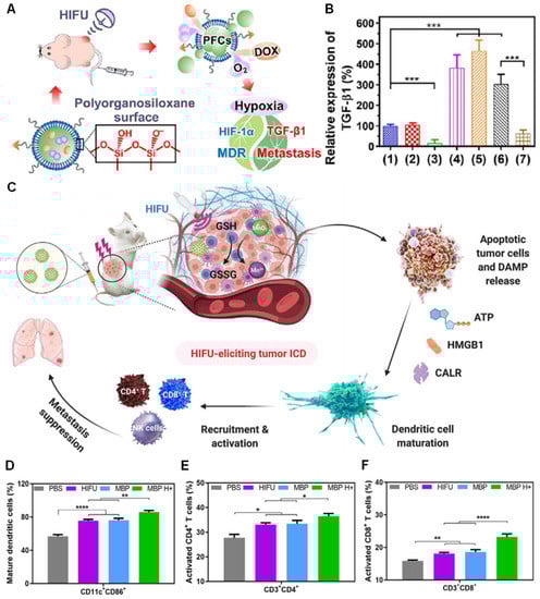 Example of nanomedicine-based HIFU to activate immune responses. (A) Schematic illustration of HIFU-triggered co-release of oxygen and DOX from PFC nanodroplets to alleviate hypoxia and inhibit tumor metastasis. (B) Relative expression levels of TGF-β1 of 4T1 cells after treatment. (1) PBS; (2) vPCs-N2 + M-HIFU; (3) vPCs-O2 + M-HIFU; (4) free DOX; (5) Doxil; (6) D-vPCs-N2 + M-HIFU; (7) D-vPCs-O2 + M-HIFU (n = 5, *** p < 0.001). (C) Schematic illustration of how MBPs enhance HIFU-induced tumor ICD. (D–F) The percentages of mature DCs (D), activated CD4+ T cells (E), and activated CD8+ T cells (F) in tumor tissues 72 h after treatment (* p < 0.05, ** p < 0.01, and **** p < 0.0001 compared with PBS or MBP H+).