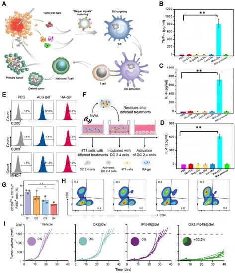 Example of nanomedicine-based MWA to activate immune responses. (A) Schematic illustration of how intra-tumoral mannose-derived CDs capture TAAs after MWA treatment and deliver them to DCs, promoting DC maturation and T cell activation, and inhibiting tumor growth and metastasis. (B–D) The concentrations of TNF-α (B), IL-6 (C), and IL-1β (D) after specific treatment. (Student’s t test was used, ** p < 0.01). (E) The expression levels of the surface markers CD80, CD83, and MHC-I in DC2.4 DCs after treatment with PBS, ALG gel, and R837-loaded ALG gel for 24 h. (F) Schematic illustration of a Transwell system for the evaluation of 4T1 residue-induced DC2.4 activation enhanced by R837-loaded ALG gel. (G,H) Quantification of TAMs-M2 (CD206hi) in CD11b+F4/80+ cell population (G) and flow cytometric analysis of CD8+T cells (* p < 0.05, ** p < 0.01). (H) after specific treatment. G1, control gel; G2, aPDL1-loaded gel; G3, IPI549-loaded gel; G4, aPDL1 and IPI549-loaded gel. (I) Individual residual tumor growth curves after specific treatment. The pie chart represents the cure rate.