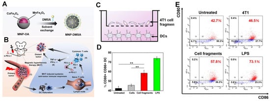 Example of nanomedicine-based MHA to activate immune responses. (A) Schematic illustration of the preparation of CoFe2O4@MnFe2O4 nanoparticles (MNP-OA) and DMSA-modified CoFe2O4@MnFe2O4 nanoparticles (MNP-DMSA). (B) Schematic illustration of how combined MHA and α-PD-L1 treatment activates anti-tumor immune responses to target metastatic tumors. (C) Schematic illustration of a Transwell system for the evaluation of DC maturation induced by MHA-generated 4T1 cell residues. (D,E) The percentage of matured DCs (CD80+ CD86+ DCs) (D) and representative FACS plots of CD80, CD86 expression on DCs gated by CD11c+ cells (** p < 0.01).