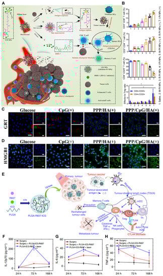 Example of nanomedicine-based PTA to activate immune responses. (A) Schematic illustration of how BMS-1-conjugated Pt NPs boost PTA-induced anti-tumor immunity. (B) Effects of Pt NPs-assisted PTA on effector and regulatory T cells in secondary tumors. (C) Evaluation of ICD level by detection of calreticulin (CRT) and HMGB1 with confocal laser fluorescence microscopy. The scale bar represents 100 μm. “+” represents laser-treated. (D) Schematic illustration of anti-tumor immunity induced by PLGA-ICG-R837-assisted PTA in combination with checkpoint-blockade. (E–H) Cytokine levels in sera from mice isolated at specific time post different treatments (surgery, surgery and s.c. injection of PLGA-ICG-R837, i.t. injection of PLGA-ICG-R837 and PTA) (* p < 0.05, ** p < 0.01, *** p < 0.001).