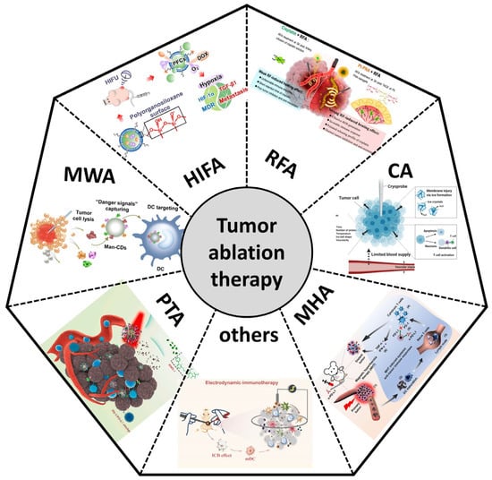 Tumor ablation is an imaging-guided, minimally invasive surgical procedure that is commonly used to treat solid tumors such as liver, kidney, lung, and brain tumors. During such a procedure, a needle-like probe guided by ultrasound, CT, or MRI is inserted into a solid tumor. Chemotherapy, alcohol, microwaves, radio waves, laser, or a freezing agent are delivered through this probe to kill the tumor cells [1,2,2,3,4]. The imaging-guided procedure was initially performed for diagnosis by needle biopsy but exploited for direct therapeutic intervention shortly after. In 1983, Sugiura and colleagues described the direct injection of absolute ethanol into small hepatocellular carcinoma (HCC) under ultrasound guidance [5], and this work was soon followed by the direct injection of chemotherapy into solid tumors of the liver, pancreas, pelvis, and lung [6,7,8,9,10,11]. In 1993, Rossi and co-workers first used radiofrequency ablation (RFA) to treat small HCC [12]. Microwave ablation (MWA) was first performed by Seki et al. in 1994 to treat HCC of less than 2 cm [13]. Cryoprobes were used to treat lesions as early as the 1960s [14,15,16], and the technology development over recent decades has expanded their clinical applications in oncotherapy, including treatment of prostate cancer [17,18,19,20,21,22]. Compared with chemotherapy, radiotherapy, and conventional surgery, tumor ablation has the advantages of being less invasive, more effective and safer, more cost-efficient, and having a larger indication range [23,24,25,26,27]. Currently, tumor ablation is included in the guidelines for the treatment of a variety of solid tumors (Scheme 1). RFA, MWA, cryoablation, and anhydrous alcohol have been recommended as local treatment for liver cancer [28,29,30]. Ablation has also become a well-established local therapy for metastatic or recurrent tumors to achieve NED (tumor-free state) or relieve symptoms and cancerous bone pain [31,32,33,34]. Although ablation therapy is an effective method for the local destruction of tumor masses, it remains a palliative measure in the treatment of advanced and disseminated tumors [35]. However, it is becoming increasingly evident that this limitation can be rectified by the use of intra-tumor immunostimulants to enhance the potential anti-tumor immune response induced by ablation therapy [36,37,38]. Unlike surgical resection of the tumor, ablation interventions result in in situ coagulative tumor necrosis with the release of tumor antigens and danger-signaling molecules, which in turn may potentially activate or enhance the body’s anti-tumor immune response.