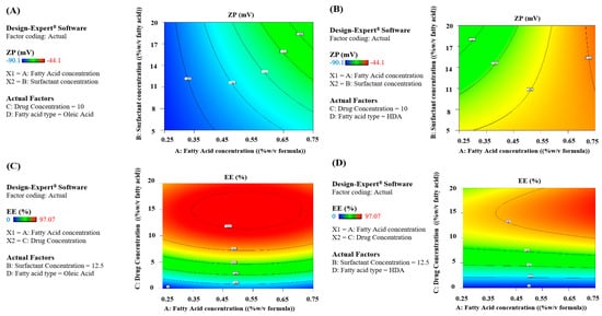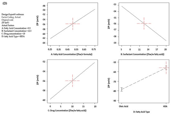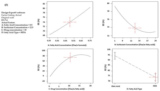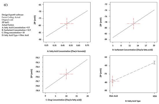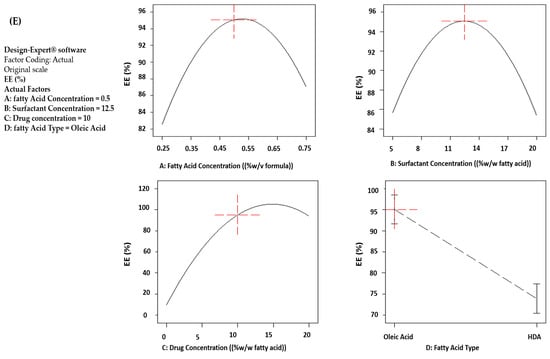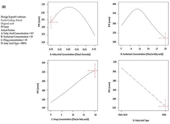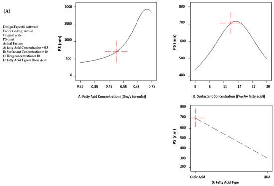 The main effect plots, illustrated in Figure 2A,B, revealed that the average PS of the formed vesicles increased exponentially by raising OA concentration from 0.25 to 0.75% (w/v). It is to be noted that high concentrations of OA (0.75%) led to particles with high standard deviation values. These results are well correlated with [51,52] because higher OA concentration resulted in the formation of larger bilayer vesicles aiming at reducing the exposure of hydrocarbon chains to water [31]. Guo and co-workers also reported that high concentrations of lipids resulted in increased vesicle flexibility with consequent larger PS due to their ability to include more molecules [53]. On the other hand, HDA-based vesicles revealed a parabolic size pattern when the rising HDA concentration was from 0.25 to 0.75%, with a size peak at 0.5%. This might be attributed to the formation of smaller size micelles instead of vesicles at higher concentrations of HDA (0.75%). A similar observation had been reported in a previous work where dexamethasone-loaded OA vesicles exhibited the same pattern [36].