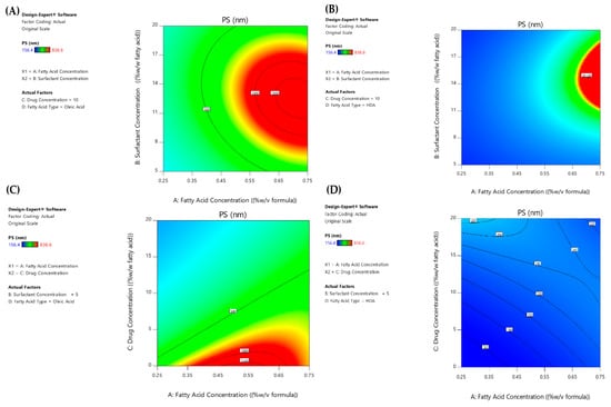 ANOVA test results confirmed that all studied independent variables revealed significant effects (p < 0.05), yet with variable magnitudes on the PS of the prepared vesicular formulations. The concentrations of both fatty acid (A) and drug (C) demonstrated the highest impacts on vesicle sizes, while the surfactant concentration and the fatty acid type were the least as delineated from their corresponding F-values.