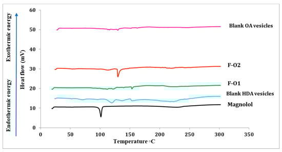 The thermal behaviors of Mag, HDA, plain ufasomes, plain HDA vesicles and optimized Mag-loaded formulations were examined. A fixed amount of each powder (1 mg) was placed in an aluminum pan followed by folding, noting that all formulations were air dried in an aluminum pan overnight till powder formation. Over a temperature range of 20 to 300 °C, the thermogram was plotted at a nitrogen gas flow rate of 20 mL/min and a heating rate of 10 °C/min [24].