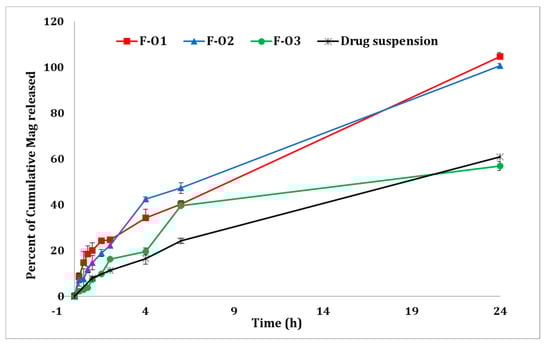 To compare the release profile of optimized Mag-loaded vesicles to the free drug suspension, the previously described non-equilibrium dialysis method was used with a minor modification [29]. Briefly, an own-designed cell composed of two compartments was fabricated. The donor compartment was filled with the test formulation, while the receptor compartment contained 25 mL of dissolution medium (PBS, pH 7.4 containing 2% w/v Tween® 80). The two compartments were separated by a dialysis membrane (molecular weight cut-off diameter 14 KDa), and the cell temperature was set at 37 °C. At fixed time intervals, 0.25, 0.5, 1, 2, 4, 6, 8, 24 and 48 h, a sample of 1 mL was taken out of the receptor compartment and was replaced with an equivalent volume of fresh dissolution medium. The drug concentration was determined by spectrophotometry at the predetermined λmax using the constructed calibration curve. The concentration was converted to a percentage cumulative drug release and was then drawn against time, constructing the release profile [30].