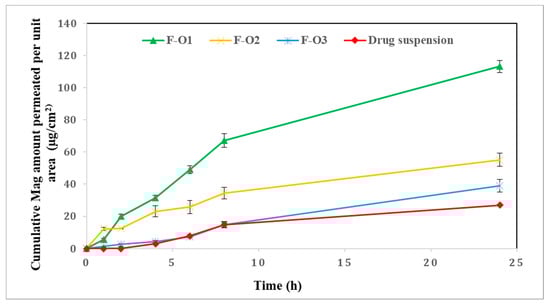The skin permeation of the optimized formulations was studied through the excised rat skin using our own-fabricated cells. The available diffusion area was 5.7 cm2. The full-thickness rat skin was fixed between the donor and receptor compartments so that the side of the stratum corneum of the skin was facing the donor compartment. The receptor chamber was filled with 25 mL of PBS (pH 7.4) containing Tween® 80 (2%, w/w) to achieve sink condition. The cell was placed in a shaking water bath set at 45 rpm, and its temperature was maintained at 37 °C [31] till the end of the experiment. A specified weight of Mag-loaded vesicular formulation, equivalent to the calculated specified amount of Mag, was applied onto the skin in the donor compartment side. At specific time intervals of 0.25, 0.5, 1, 2, 4, 6, 8, 12, and 24 h, a 1-mL sample was withdrawn from the receiving medium and instantly replaced with an equal volume of fresh dissolution solution. The amount of drug in the samples was analyzed using the HPLC method described earlier [29]. The cumulative amount of Mag permeated per unit area was calculated using the following equation [32]: