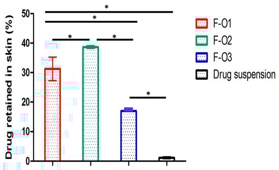 The skin was separated from the cell after 24 h of the permeation study and thoroughly washed with filtered distilled water. The excised skin was placed in a falcon tube in PBS pH 7.4 containing 2% Tween® 80 and methanol (HPLC grade) at a ratio of 1:1 v/v. Then the tube content was homogenized and centrifuged at 3000 rpm, 4 °C for 15 min. The samples were filtered with 0.22 µm disposable filters and then analyzed for drug content by HPLC. The percent of drug retained in the skin was calculated [24].
