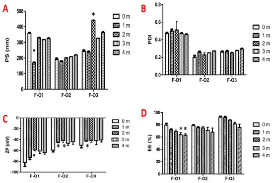 To investigate how storage affects the preparations’ physical stability, the optimized OA and HDA vesicular dispersions were stored under refrigeration at 5 ± 3 °C for 4 months, and the various formulation parameters PS, PDI and EE were measured initially and at 1-month intervals for 4 months [34].