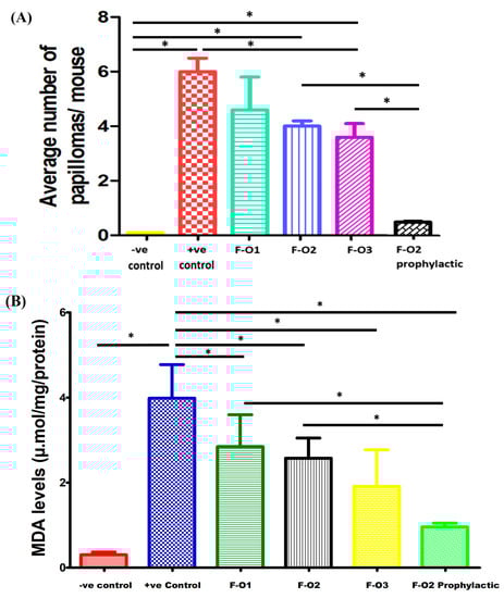 As obvious in Figure 11A, both HDA-based vesicles (F-O2 and F-O3) revealed a significantly lower number of papillomas (p < 0.05) when compared to the positive control, while OA-based vesicles (F-O1) showed a non-significant difference (p > 0.05).