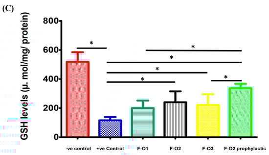 GSH is a substantial antioxidant, and its expression at high levels indicates effective treatment for cancer [40]. GSH expression data were also consistent with MDA results. Group VI receiving prophylactic treatment showed a significant increase in GSH levels (316.00 ± 58.90 µmol/mg of protein) (p < 0.05) compared to the other groups, as seen in Figure 11C. It could be noted from Figure 11C that GSH levels can be arranged as follows; F-O2 > F-O3 > F-O1. Groups IV and V, treated with F-O2 and F-O3, respectively, showed a significant increase in GSH levels (p < 0.05) compared to Group II (positive control), which proves their effectiveness in skin cancer treatment. These superior results of HDA-based formulations could be attributed to the synergistic antioxidant and antitumor effects of HDA [49].