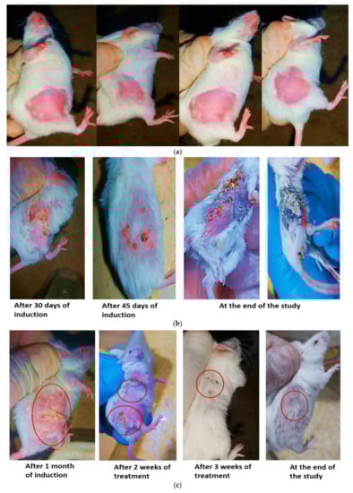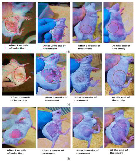 After 2 weeks of treatment, Figure 12d,e reveals that Groups IV and V treated with F-O2 and F-O3, respectively, showed significant improvement in skin condition manifested as reduced inflammation and a decrease in the number and size of papillomas. On the other hand, Group III, treated with F-O1, illustrated in Figure 12c, did not show marked improvement, although no further deterioration occurred. Groups IV and V, Figure 12d,e, show further enhancement in overall skin condition; regrowth of hair with no skin inflammation could be observed. Group III, Figure 12c, started to show improvement compared to previous weeks of treatment, manifested as a marked reduction in the size of papillomas with obvious hair growth. The obtained results are ascribed to the enhanced permeability of Mag from HDA vesicles and also confirm the synergistic effect of HDA as an anti-cancer [61].