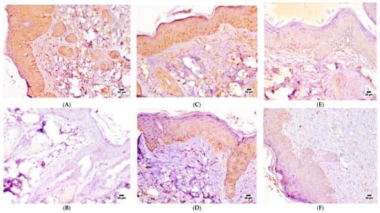 Photomicrographs of mice skin sections of (A) Group I (negative control), (B) Group II (positive control), (C) Group III (F-O1), (D) Group IV (F-O2), (E) Group V (F-O3) and (F) Group VI (prophylactic F-O2) (immune staining).