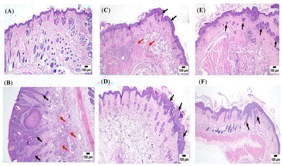 Skin photomicrographs of (A) Group I (negative control), (B) Group II (positive control) showing downward projections of neoplastic cells into the underlying dermis (black arrows), Intense mononuclear inflammatory cells infiltration at the dermal layer (red arrows), (C) Group III (F-O1) showing mild thickening in the epidermis (black arrows) with diffuse inflammatory cells infiltration and numerous severely dilated blood vessels at the dermis (red arrows), (D) Group IV (F-O2) showing thickened epidermis with downward growths (black arrows) with diffuse inflammatory cells infiltration in the dermis, (E) Group V (F-O3) showing acanthosis with separation of neoplastic cells forming bird nest appearance (black arrows) and (F) Group VI (prophylactic F-O2) showing small epidermal projections with diffuse inflammatory cells infiltration (black arrows) (H&E staining).