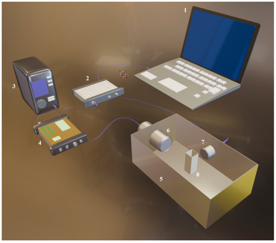 Experimental system used for SP experiments. 1—personal computer; 2—waveform generator/oscilloscope; 3—high-voltage power supply; 4—push–pull topology pulser; 5—experimental bath; 6—excitation transducer; 7—receiver, 8—cuvette.