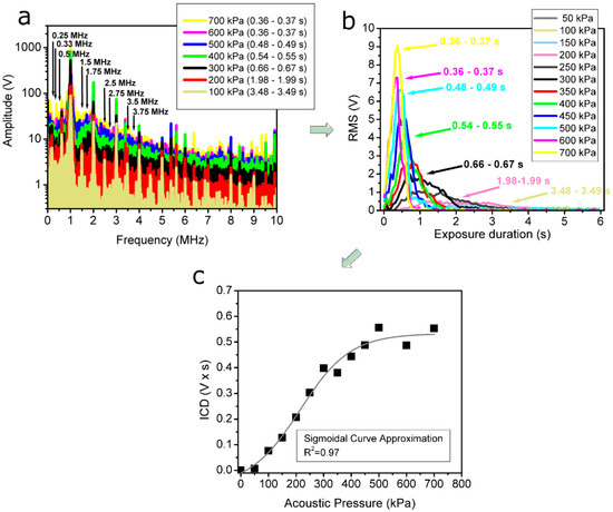 The curves of differential RMS quantified in the 1.4–1.6 MHz frequency range (around the first ultraharmonic—1.5 MHz) at different acoustic pressures are given as an example in Figure 3b. In order to obtain the differential cavitation dose (CD), or simply CD, differential RMS was integrated with respect to the exposure duration [26].