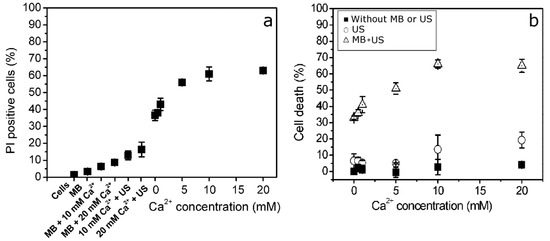 We evaluated the impact of different Ca2+ concentrations on the integrity of the cell membrane. For this purpose, Ca2+ together with MBs was administered before US (300 kPa) application, while the cell membrane permeability marker, PI, was administered after SP. The obtained results indicate that an increase in Ca2+ concentration facilitates an inward PI flux in up to ~65% of cells from the total cell population (Figure 4a).
