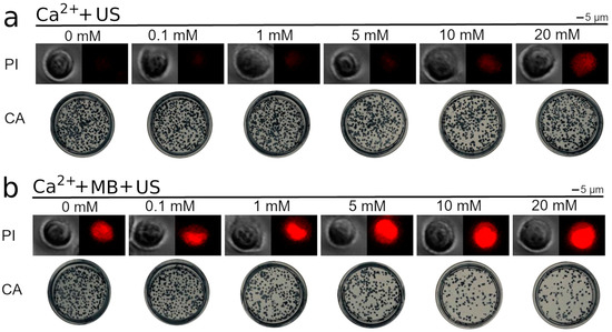 Cell membrane permeability (PI assay, PI) and cell viability (clonogenic assay, CA) depending on different Ca2+ concentrations after US (a) or US + MB (b) treatment at 300 kPa acoustic pressure.