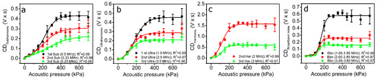 CD, evaluated at different acoustic pressures for subharmonics—CDSubharmonic (a); ultraharmonics—CDUltraharmonic (b); harmonics—CDHarmonic (c); and broadband noise—CDBroadband noise (d). Abbreviations: “Sub”—subharmonic; “Ultra”—ultraharmonic; “Har”—harmonic; and “Bbn”—broadband noise.