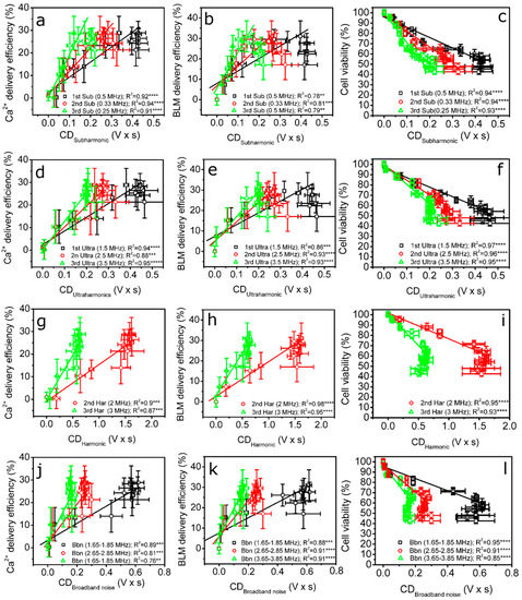 The results of the correlation analysis between CD and the level of the efficiency of the biological effect: CDSubharmonic and the efficiency of Ca2+ (a) or BLM (b) delivery as well as the viability of cells (c); CDUltraharmonic and the efficiency of Ca2+ (d) or BLM (e) delivery as well as the viability of cells (f); CDHarmonic and the efficiency of Ca2+ (g) or BLM (h) delivery as well as the viability of cells (i); CDBroadband noise and the efficiency of Ca2+ (j) or BLM (k) delivery as well as the viability of cells (l). Abbreviations: “Sub”—subharmonic; “Ultra”—ultraharmonic; “Har”—harmonic; and “Bbn”—broadband noise. ** p < 0.01; *** p < 0.001; **** p < 0.0001; ***** p < 0.00001.