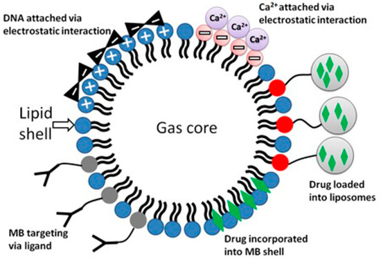 It was explicitly shown by Lentacker et al. that the anticancer drug DOX can be loaded onto MBs and effectively delivered to cells [5]. Presumably, the employment of MBs as carriers—biological vectors bearing modified negatively charged lipids in the shell and capable of binding Ca2+ via electrostatic interaction—is exceptionally promising. The latter would increase the delivery of the payload and ensure efficient antitumor therapy accompanied by enhanced site-specificity and minimal off-target delivery, as well as reduced systemic toxicity. Such a hypothetical Ca2+-loaded MB is presented in Figure 12.