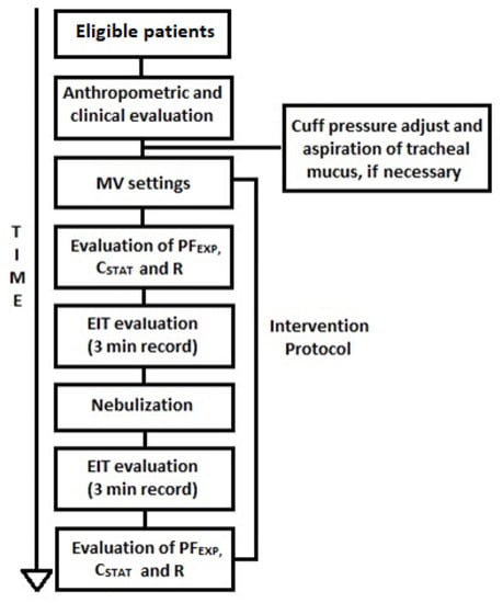 An impedance tomography device (ENLIGHT, Timpel, Brazil) was used with the patient in supine position in a bed elevated to 30°, and a belt with 32 electrodes was applied to their chest in the position corresponding to the 4th–5th intercostal space on shaved skin. The electrodes were positioned for reading electrocardiograms and a flow sensor was attached to the endotracheal tube. After these procedures, the data were recorded for 3 min before and immediately after nebulization [26,27].