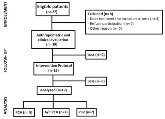 A total of 27 screened patients were eligible according to the inclusion criteria. The final sample consisted of 19 patients stratified into 3 ventilation modes: Pressure Control Ventilation (PCV), Assist/Control Pressure Ventilation (A/C PCV) and Pressure Support Ventilation (PSV). Five patients were excluded for hemodynamic instability, two for associated cardiac conditions and one for an endotracheal tube diameter less than 7.5 mm (Figure 2).