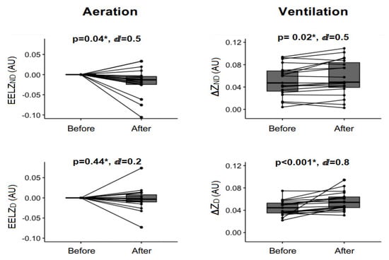 Figure 3 shows a pre-post joint analysis of all ventilation modes. The nebulized bronchodilator increased the total impedance ventilation ΔZTOT from 0.09 (0.036) to 0.113 (0.034), reflecting an increase of 25.5% in ventilation, with p < 0.01 and a large effect size (ⅆ = 0.8). In the ROI analysis, there was an increase in non-dependent impedance variation (ΔZND) and in dependent impedance variation (ΔZD) lung regions, with p = 0.02, ⅆ = 0.5 and p < 0.01, ⅆ = 0.8, respectively.