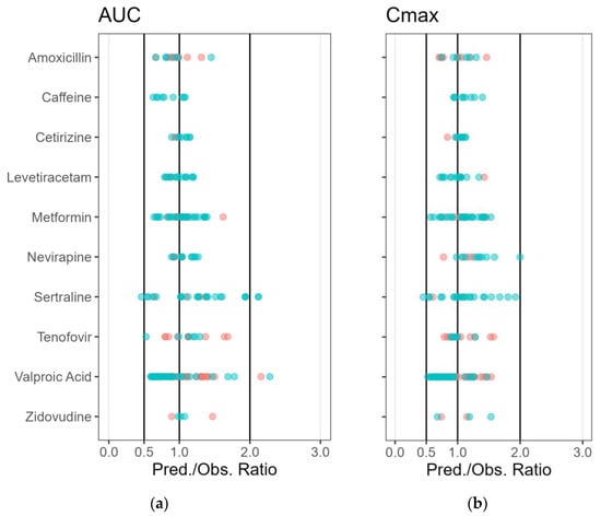 A PBPK model for IV administration of amoxicillin was taken from the literature, and extended for oral administration []. The metformin PBPK model for IV and oral administration was taken from the literature []. For caffeine, the built-in ‘predefined template’ available in PK-Sim was used. For the other compounds, the PBPK models were developed for non-lactating female or male healthy adult and/or patient individuals. Details about the model development and evaluation of the predictive performance are described in medicine-specific reports available in Supplementary Files S1–S10. Figure 3 shows the relative predicted/observed ratios for AUC and Cmax for the PBPK models using either the training or verification datasets.