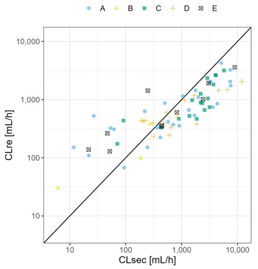 Predicted reuptake clearance (CLre) and secretion clearance (CLsec) values for medicines included in the original dataset as predicted by Koshimichi et al. (2011) in the original publication [] for medicines with: (A) net reuptake (i.e., total free fraction multiplied with reuptake clearance) values < 5000 mL/h, total free fraction in milk determined experimentally and no evidence for transporter-mediated transfer; (B) net reuptake values < 5000 mL/h, total free fraction in milk determined experimentally and transporter-mediated transfer; (C) net reuptake values < 5000 mL/h and total free fraction in milk predicted; (D) net reuptake > 5000 mL/h; and (E) calculated reuptake and secretion clearance values for medicines for which PBPK models were developed in the present study.