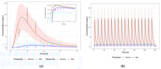 Median (solid line) and 5th–95th% prediction interval (shaded area) for: (a) oral administration of amoxicillin 1000 mg as single dose []; and (b) oral administration of amoxicillin 1000 mg thrice daily in plasma (red) and human milk (blue). Circles represent observed data from the literature with standard deviation (error bars) [].