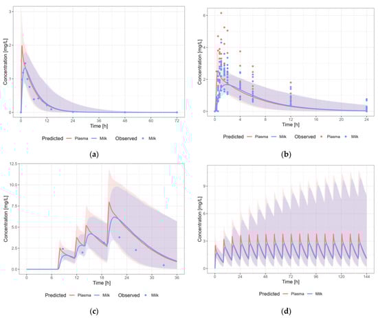 Median (solid line) and 5th–95th% prediction interval (shaded area) for (a) oral administration of caffeine 80 mg as single dose []; (b) oral administration of caffeine 100 mg as single dose []; (c) oral administration of 100 mg caffeine as multiple dose []; and (d) oral administration of caffeine 100 mg thrice daily in plasma (red) and human milk (blue). Circles represent observed data from the literature [,,].
