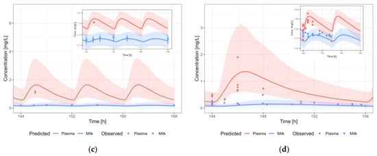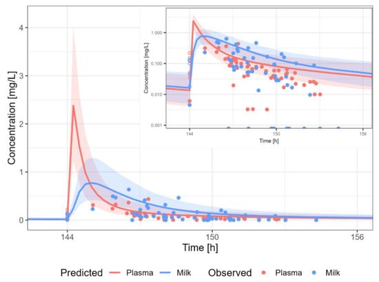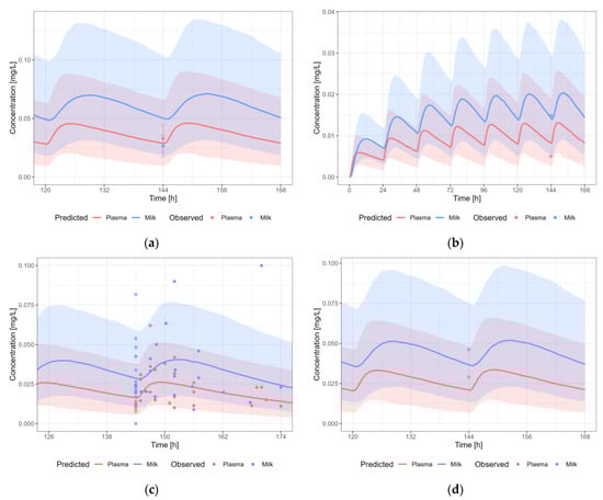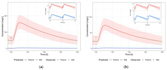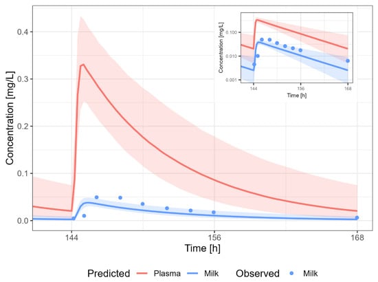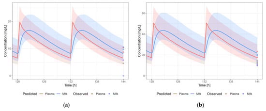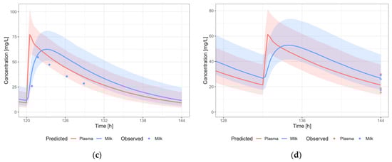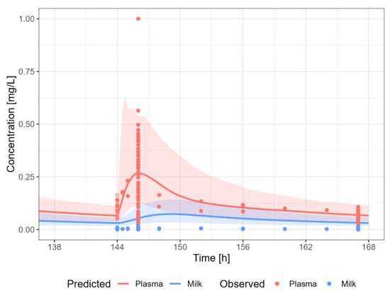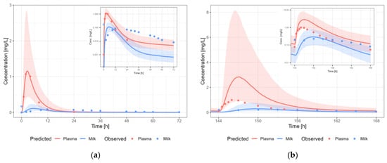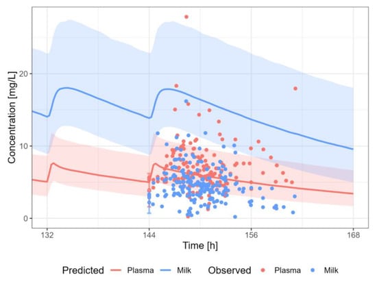 Information about the dose or time after last dosing for lactation is often missing. Therefore, the evaluation of the predictive performance was case-by-case and mainly based on visual inspection of the predicted versus observed concentration-time profiles in plasma and human milk, and whether the observed data in human milk were within the 5th–95th percentile of the population prediction, in view of the availability and/or quality of the data.