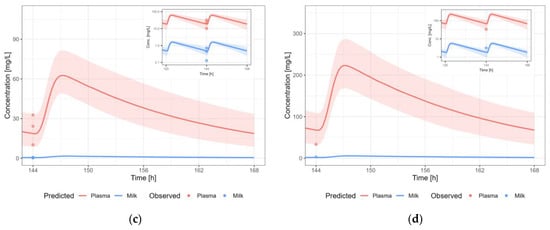 Additional refinement of the present PBPK models will be based on permeability coefficients generated in an in vitro model for the blood–milk barrier. This will improve predictions for medicines with transport routes (e.g., active transport) or physicochemical properties that are not fully captured by the semi-mechanistic model from Koshimichi et al. (2011) [] (e.g., the model is quite sensitive to the input value for LogP and LogD). These data are currently being generated with a newly developed in vitro model based on human mammary epithelial cells []. Furthermore, in vivo data are generated in the Göttingen minipig, which are expected to reveal additional mechanistic insights.