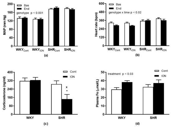Mean arterial blood pressure (a), heart rate (b), plasma corticosterone (c) and plasma iron levels (d). The results are the mean ± SEM. * p < 0.01 vs. control SHR, x p < 0.03 vs. ION-treated WKY group. Abbreviations: MAP, mean arterial blood pressure; Bas, basal levels; End, levels determined 100 min post-infusion; SHR, spontaneously hypertensive rats; WKY, Wistar-Kyoto rats; Cont, control group; ION, iron oxide nanoparticle-treated group.