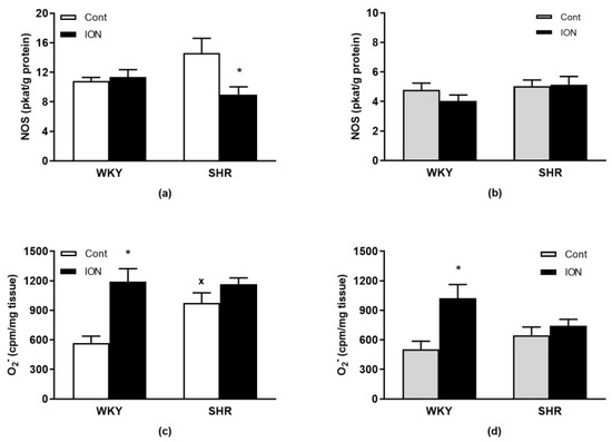 For superoxide productions, there were significant interactions of genotype and treatment in both the liver (F(1,20) = 4.9, p < 0.04) and the LHV (F(1,20) = 4.7, p < 0.05) with significantly higher levels found in ION-treated WKY compared to control WKY (Figure 2c,d). Higher superoxide production was found in the liver of control SHR vs. control WKY (Figure 2c). However, no changes in superoxide productions were found in ION-treated SHR vs. control SHR in both the liver and LHV (Figure 2c,d).