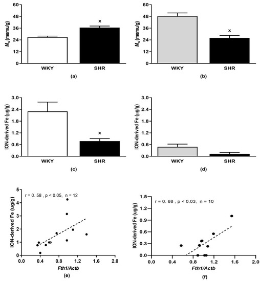 Saturation magnetization in the liver (a) and left heart ventricle (b). Iron oxide nanoparticle-originated iron content in the liver (c) and left heart ventricle (d). Pearson correlations between ION-originated iron and Fth1 gene expressions in the liver (e) and left heart ventricle (f). The results are the mean ± SEM, x p < 0.04 vs. the WKY group, n = 5–6/group. Abbreviations: Ms, saturation magnetization; ION, iron oxide nanoparticles; Fth1, ferritin gene; Actb, β-actin gene. For other abbreviations see the legend to Figure 1.