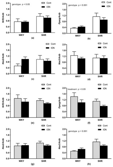 Relative mRNA expressions of Nfe2l2, Pparg, Nos2 and Nos3 in the liver and LHV are shown in Figure 4. There were significant main effects of genotype for Nfe2l2 (F(1,20) = 4.59, p < 0.05, Figure 4a) and Pparg (F(1,20) = 16.23, p < 0.001, Figure 4b) in the liver and for Nos3 (F(1,20) = 17.96, p < 0.001, Figure 4h) in the LHV, with higher levels found in SHR. A significant effect of ION treatment was found only for Pparg (F(1,20) = 4.59, p < 0.05) in the LHV with lower levels in ION-treated rats compared to controls (Figure 4f).