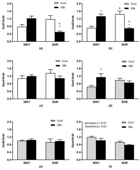 Gene expressions of selected enzymes involved in antioxidant defence Sod1 (a,d), Sod2 (b,e) and Gpx4 (c,f) in the liver (a–c) and left heart ventricle (d–f). The values represent the mean ± SEM. * p < 0.03 vs. the control group of the same genotype, + p < 0.02 vs. ION-treated WKY group, x p < 0.01 vs. WKY control group, n = 6/group. See Results section for detailed results of 2-way ANOVA analysis. Abbreviations: Sod1, superoxide dismutase 1; Sod2, superoxide dismutase 2; Gpx4, glutathione peroxidase 4. Other abbreviations are the same as in the Figure 1.