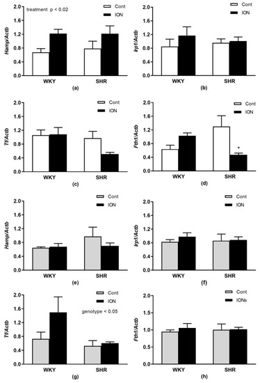 In Figure 6, relative mRNA expressions of genes involved in iron metabolism regulation or iron carrying and storage are depicted. A significant effect of ION treatment was found only for Hamp (F(1,20) = 6.74, p < 0.02) in the liver with higher levels in ION-treated rats compared to controls (Figure 6a). Significant interactions of genotype and treatment in the liver were found only for Fth1 (F(1,20) = 9.06, p < 0.01, Figure 6d); there was a significant decrease in Fth1 mRNA in ION-treated SHR vs. control SHR. In the LHV, there was a significant reduction in Tf gene expression in SHR vs. WKY (effect of genotype, F(1,20) = 4.58, p < 0.05, Figure 6g). No differences were found in the gene expression of Irp1 and Tf in the liver (Figure 6b,c) and in the Hamp, Irp1 and Fth1 in the LHV (Figure 6e,f,h). In the liver, Hamp gene expression correlated positively with plasma iron levels (r = 0.58, p < 0.006, n = 21), which was not found in the LHV.
