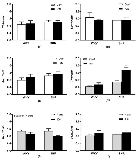 Gene expressions of selected genes associated with iron transport in the liver (a–c) and left heart ventricle (d–f). The values represent the mean ± SEM. * p < 0.03 vs. the control group of the same genotype, + p < 0.02 vs. ION-treated WKY group, n = 6/group. See Results section for detailed results of 2-way ANOVA analysis. Abbreviations: Tfr1, transferrin receptor 1; Dmt1, divalent metal transporter 1; Fpn 1, ferroportin 1. Other abbreviations are the same as in Figure 1.