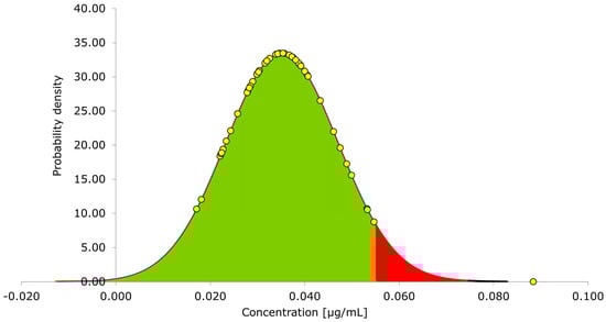 Normal distribution of the anti-drug antibody against infliximab concentration measured in 50 negative human plasma samples as part of the cut-point validation. 95% confidence interval (CI) highlighted in green and 5% chance of false positive (x > µ + 1.65 × standard deviation) highlighted in red.