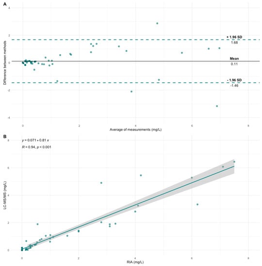 A total of 67 remanent plasma samples were used for the cross-validation of the RIA with the LC-MS/MS method. Seven plasma samples were above the upper limit of quantification (ULOQ) of 880 arbitrary units (AU)/mL which equates to 8.8 mg/L for the RIA assay. This conversion between AU/mL and mg/L has previously been described in a cross-validation study between the RIA and ELISA []. To further investigate the results of these samples, they were diluted and re-measured. These results of the ULOQ samples correlated poorly and were therefore not included in the data comparison.