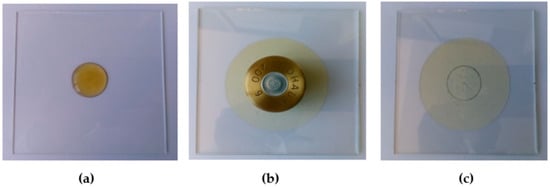 The spreadability of a honey and its pre-gel solution was determined following the method described by Chen et al. [43] with slight modifications. One gram of sample was placed within a circle of 2.4 cm diameter on a glass plate, and the spreading diameter was measured 5 min after placing on the sample another glass plate (mass 30.6 g) with a standardized weight of 200 g (Figure 1). Sample spreadability was calculated using the following formula: