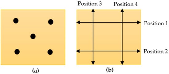 Determination of the dimensions of wet and dry sheets: (a) Positions for measuring thickness; (b) Positions for measuring length.