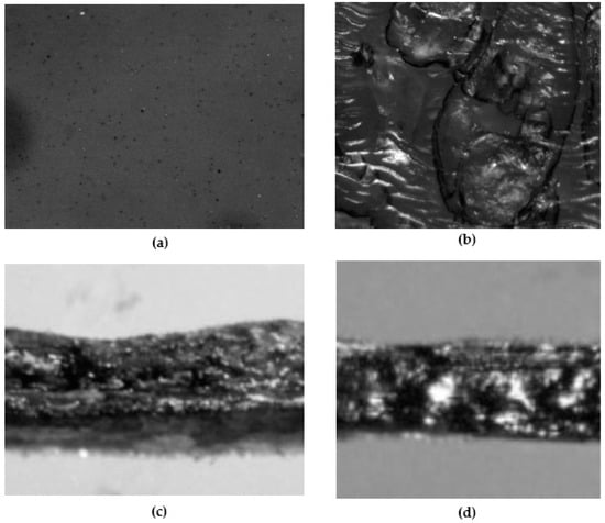 Gross morphology of the WA Jarrah honey-loaded wet and dry sheets as seen under a stereomicroscope (5× magnification): (a) Wet sheet (surface view); (b) Dry sheet (surface view); (c) Wet sheet (cross-sectional view); (d) Dry sheet (cross-sectional view).