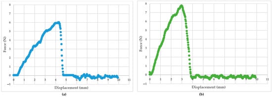 Representative force (N) and displacement (mm) curve: (a) honey-based wet sheet; (b) honey-based dry sheet.