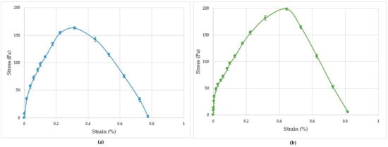 Representative load–displacement curves for the wet and dry sheets are shown in Figure 4. The initial linear part of the load–displacement curve corresponds to the strain potential energy stored in the sample when a load was applied. When the applied load was high enough to create a new surface area, the introduced crack started to propagate until the test specimen failed catastrophically. Figure 5 shows the representative stress–strain curves for the wet and dry sheets and the recorded tensile strength is presented in Table 7. The tensile strength ranged from 100.11 to 111.15 Pa for the wet sheets and 185.28 to 200.45 Pa for the dry sheets. Irrespective of the type of honey load, the dry sheets consistently demonstrated tensile strength that was between 75 and 85% higher than that for the corresponding wet sheets.