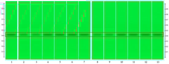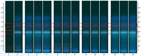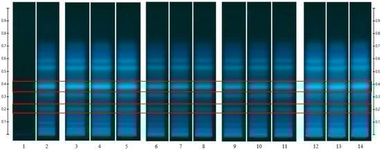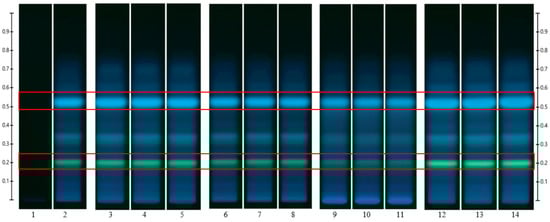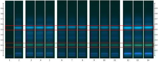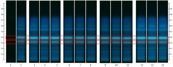 Representative HPTLC image taken at 254 nm after development with ethyl acetate. Track 1: HMF (1 mg/mL) aqueous solution; Track 2–7: WA Manuka honey 2 extracts at 1, 2, 3, 4, 5, and 6 months of storage at 30 °C; and Tracks 8–13: WA Manuka honey 2 at 1, 2, 3, 4, 5, and 6 months of storage at 40 °C. Red box highlights monitored band (Rf 0.41).
