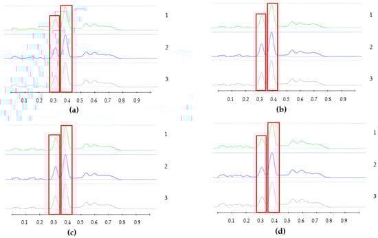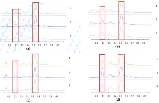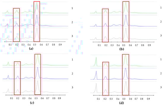 The peak areas (baseline and 6 months) of the monitored bands are presented in Table 14. Moreover, for easier comparison, the peak areas of these selected bands were calculated per wet and per dry sheet. The HPTLC fingerprints of samples from the stability study are included as a supplementary file (Supplementary Materials Figures S1–S8). The monitored bands remained unchanged over the six-month storage period.