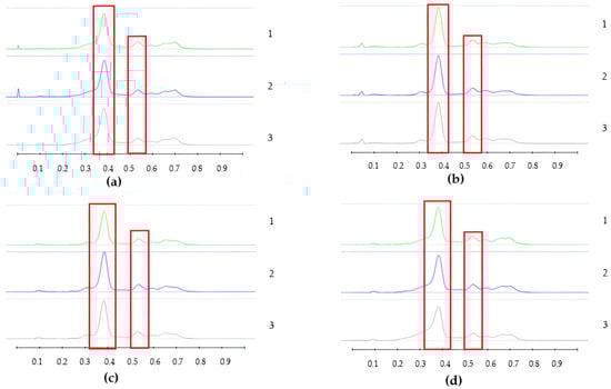 Component analysis was focused on the quantification of selected non-sugar constituents in each honey and corresponding formulations as the non-sugar constituents (e.g., phenolic, flavonoids, vitamins, and minerals) play a major role in the bioactivity of honey [12]. Component analysis was determined using High-Performance Thin-Layer Chromatography (HPTLC), which allows for the monitoring of selected bands representing individual honey constituents [50]. Briefly, 1 g of honey or honey-loaded formulation was dissolved in 2 mL of phosphate buffer solution and the resulting solution was extracted three times with 5 mL of a mixture of dichloromethane and acetonitrile (50:50 v/v). After the addition of MgCl2 anhydrous to the combined organic extracts followed by filtration, the extraction solvent was evaporated using compressed air and the resulting organic extract was reconstituted in 100 µL of methanol prior to HPTLC analysis. The chromatographic separation was performed on silica gel 60 F254 HPTLC glass plates in an automated development chamber (ADC2, CAMAG, Muttenz, Switzerland) using a mixture of toluene-ethyl acetate-formic acid, 1:6:1 (v/v) as the mobile phase. The obtained chromatographic results were documented using an HPTLC imaging device (TLC Visualizer, CAMAG) under white light, 254 nm and 366 nm, respectively. The chromatographic images were digitally processed and analysed using a specialized HPTLC software (visionCATS, CAMAG). The peak area of selected bands obtained from each honey-based formulation was compared with that of the corresponding bands in the respective neat honey and reported as a percentage. The analysis was carried out in triplicate for each formulation and the results were expressed as mean ± SD.